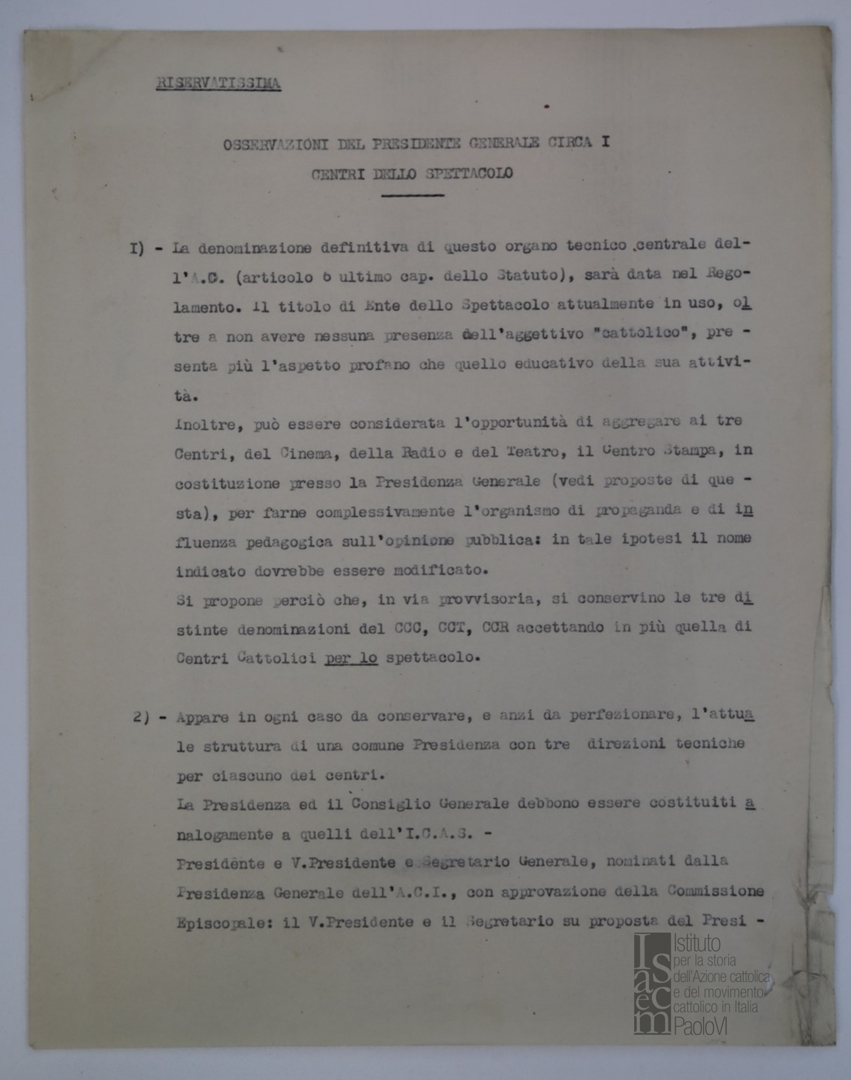 "Osservazioni del Presidente generale circa i Centri dello spettacolo"