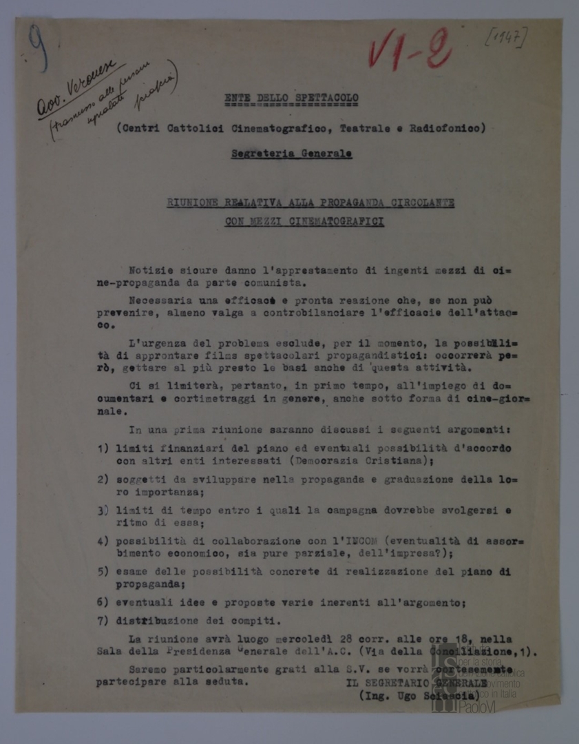 "Ente dello spettacolo. Centri cattolici cinematografico, teatrale e radiofonico. Segreteria generale. Riunione relativa alla propaganda circolante con mezzi cinematografici"