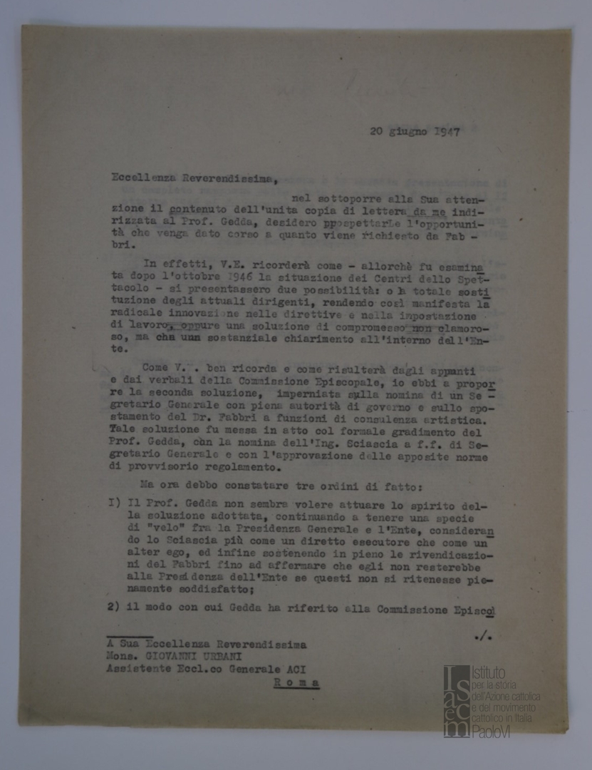 Vittorino Veronese invia a mons. Giovanni Urbani alcune considerazioni in merito al rinnovo della dirigenza dei Centri dello spettacolo. Dattiloscritto