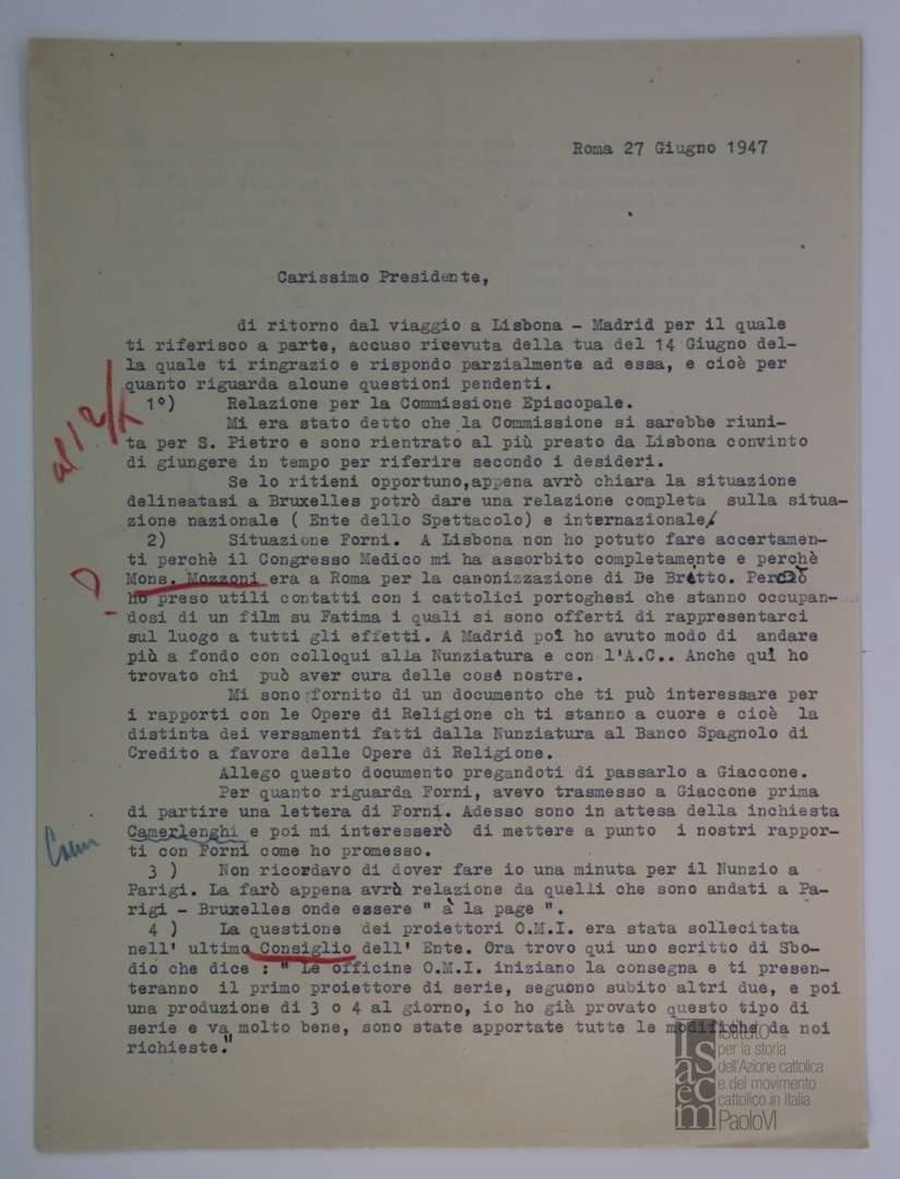 Lettera di Luigi Gedda, presidente dell'Ente dello spettacolo, a Vittorino Veronese, presidente generale dell'ACI