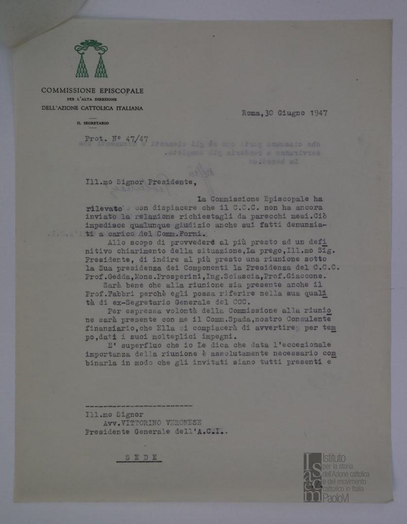 Lettera di mons. Giovanni Urbani, vescovo di Assume e assistente ecclesiastico generale dell'ACI, a Vittorino Veronese, presidente generale dell'ACI