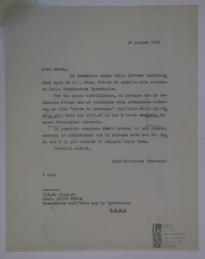 Lettera di Vittorino Veronese, presidente generale dell'ACI, a Luigi Gedda, presidente dell'Ente dello spettacolo