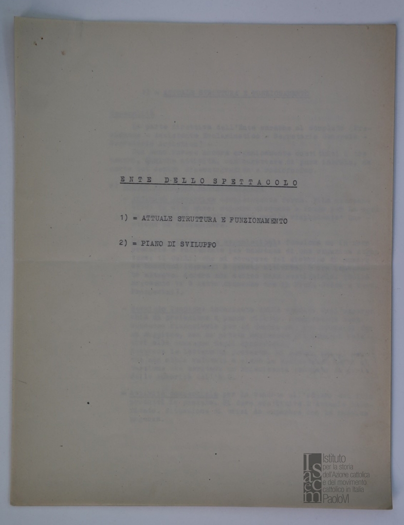 "Ente dello spettacolo. 1) Attuale struttura e funzionamento 2) Piano di sviluppo"