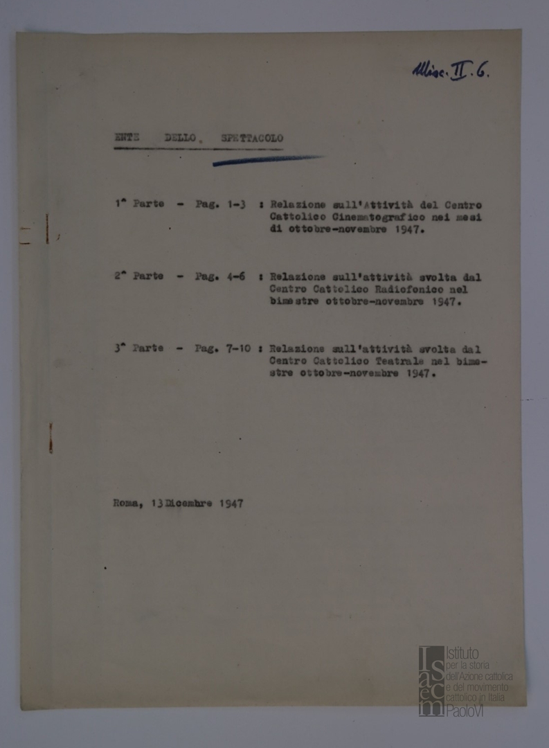Attività del CCC, a cura di Ildo Avetta: film catechistici, segnalazioni cinematografiche, consegna dei proiettori, salone di proiezione, spettacoli per il clero ed i collegi, "Guerra alla guerra", stampa. Attività del CCR, a cura di Daniele Fabbri: attività generale, collaborazione con la RAI, collaborazione con la Radio Vaticana. Attività del CCT, a cura di Turi Vasile, Dattiloscritto