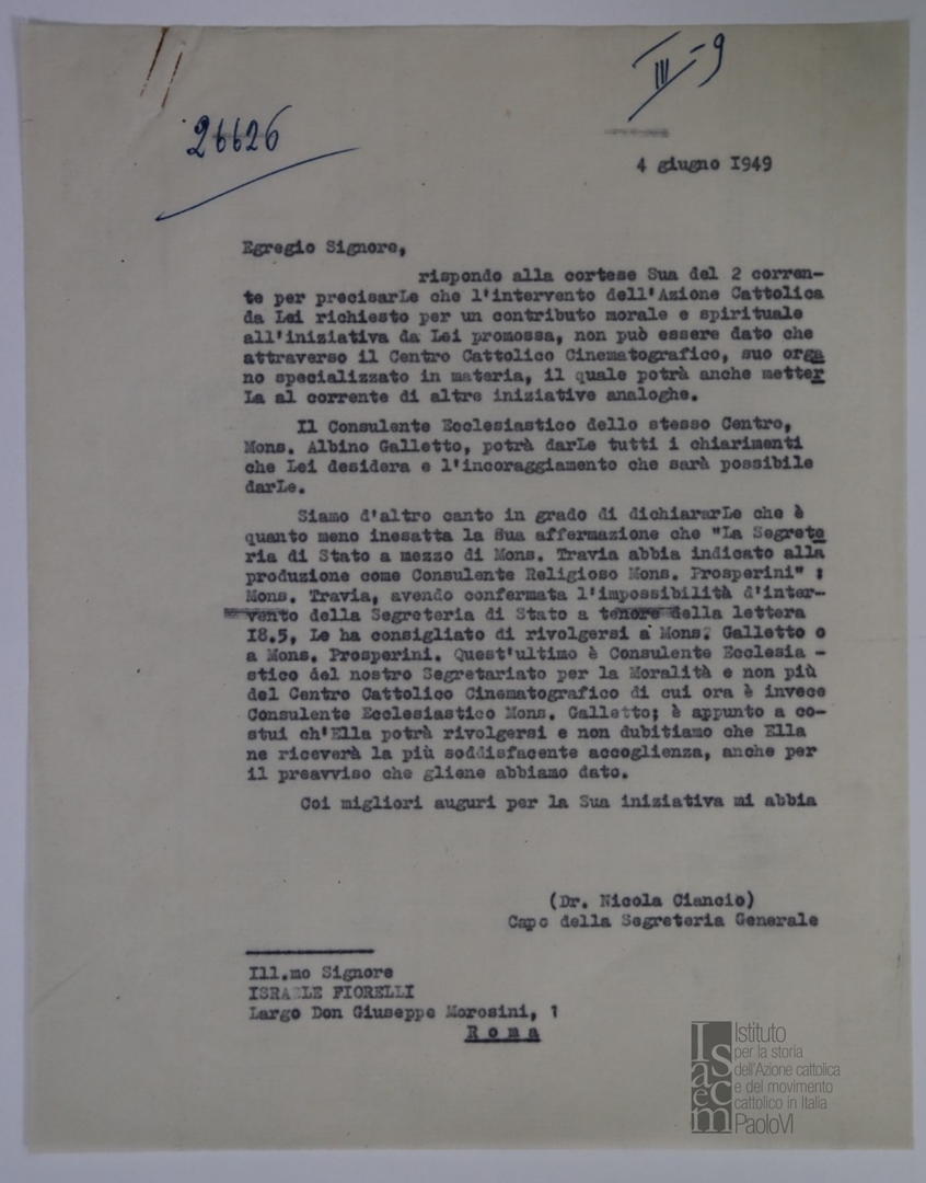 Nicola Ciancio fornisce a Israele Fiorelli alcuni chiarimenti sulle figure di riferimento e sugli enti coinvolti nel progetto di realizzazione di un film sull'Anno santo. Dattiloscritto