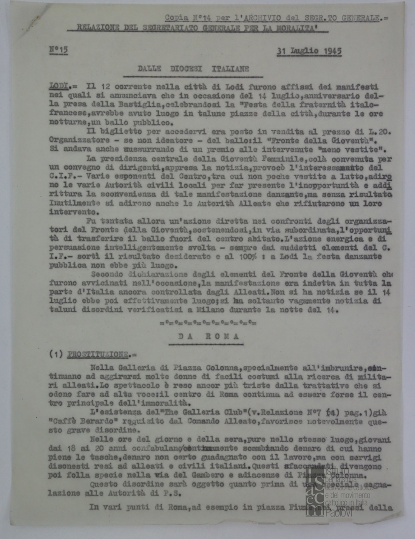"Relazione del Segretariato Generale per la Moralità. Nr. 15"