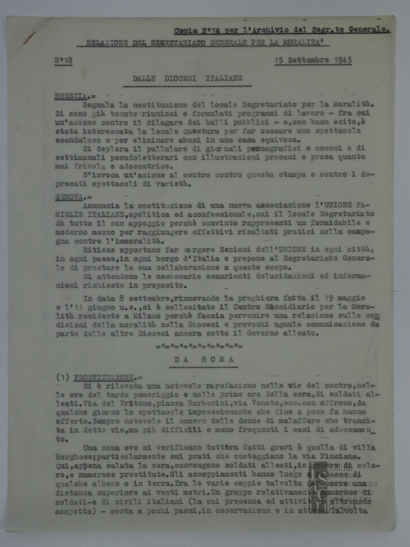 "Relazione del Segretariato Generale per la Moralità. Nr. 18"