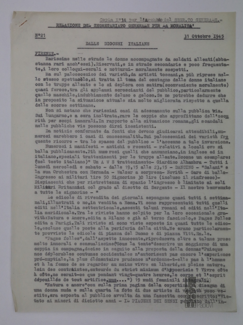 "Relazione del Segretariato Generale per la Moralità. Nr. 21"