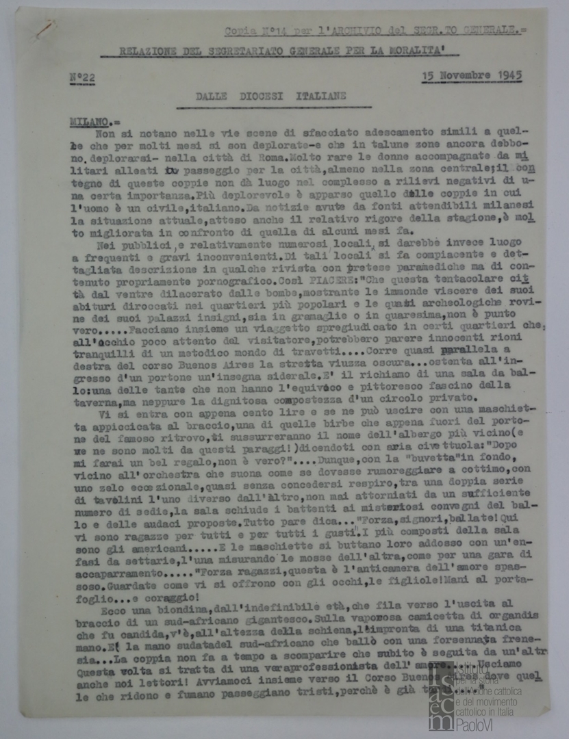 "Relazione del Segretariato Generale per la Moralità. Nr. 22"