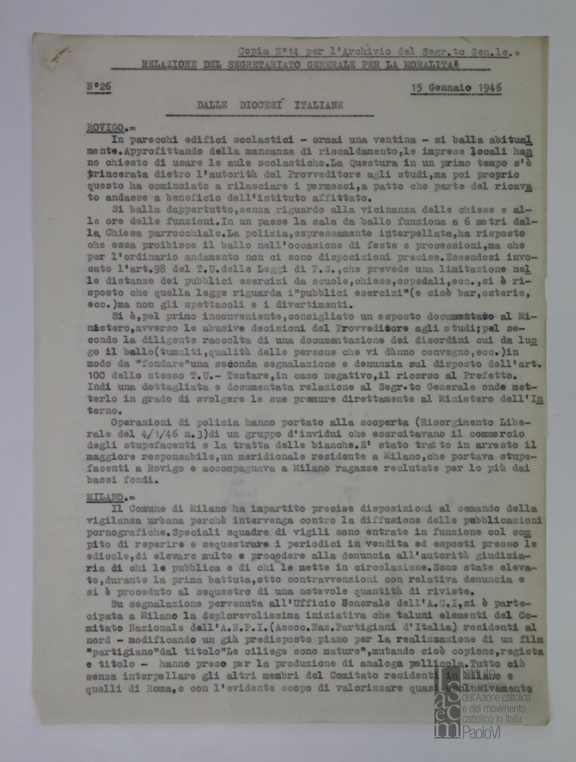 "Relazione del Segretariato Generale per la Moralità. Nr. 26"