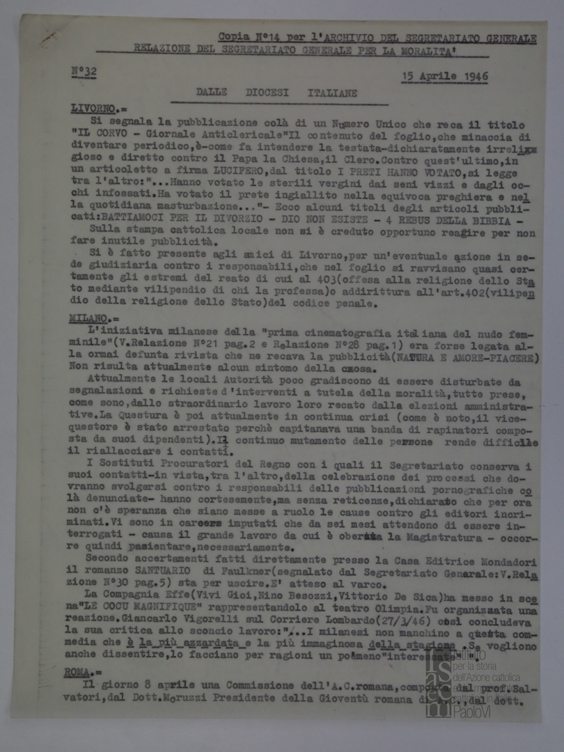 "Relazione del Segretariato Generale per la Moralità. Nr. 32"