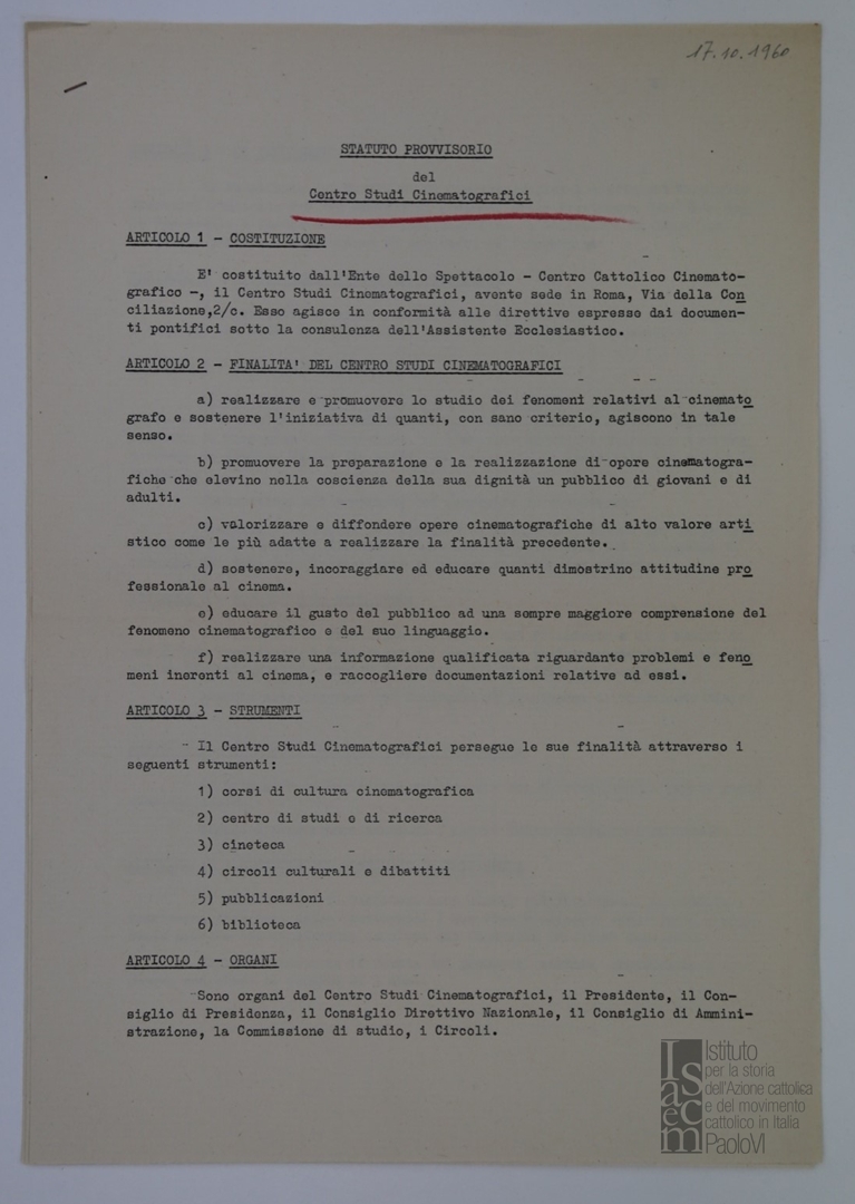 "Statuto provvisorio del Centro Studi Cinematografici"