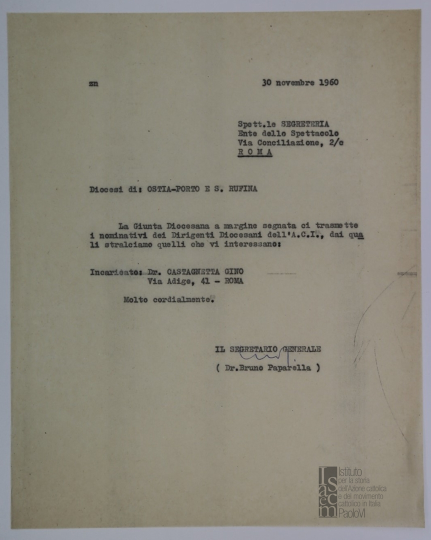 Bruno Paparella segnala il nominativo di un dirigente diocesano dell'ACI. Dattiloscritto