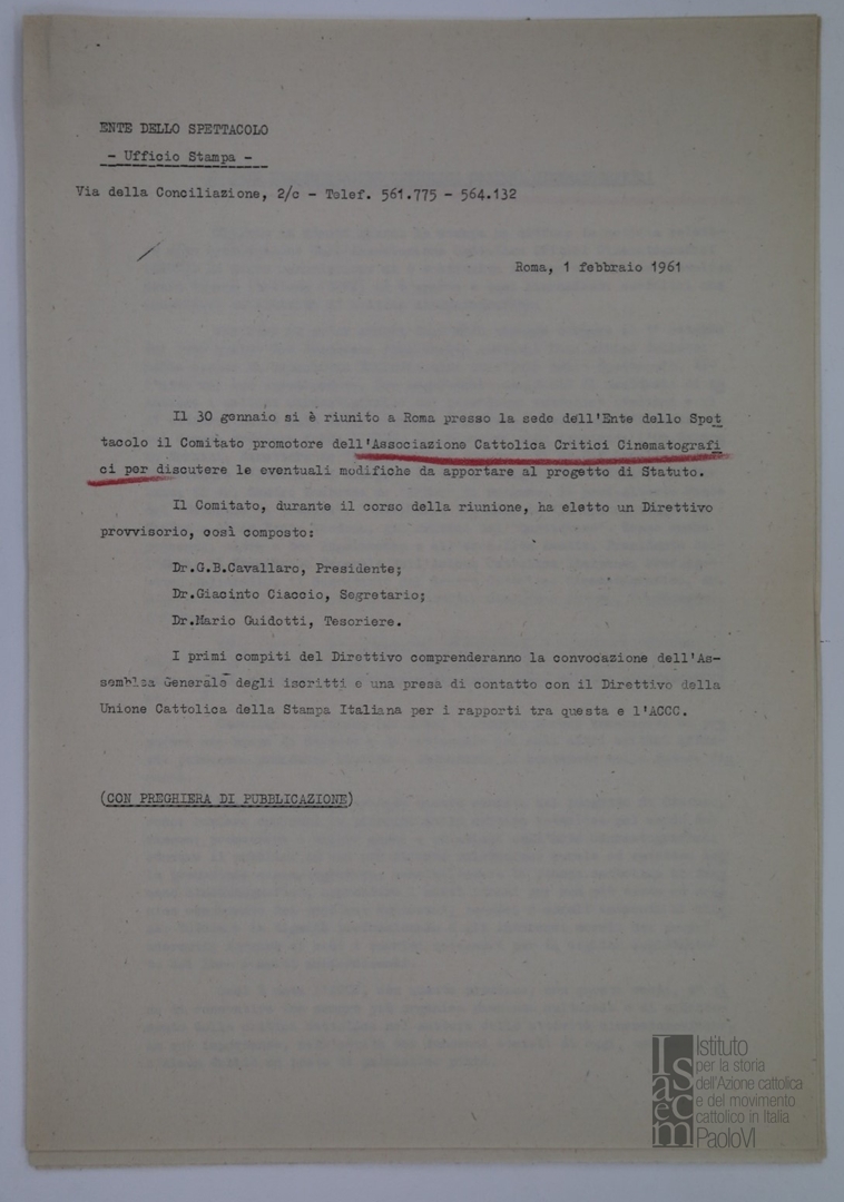 Comunicato stampa per la nascita dell'Associazione cattolica critici cinematografici - ACCC