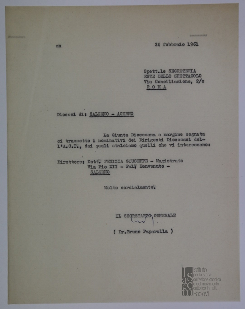 Lettera di Bruno Paparella, segretario generale dell'ACI, alla Segreteria dell'Ente dello spettacolo