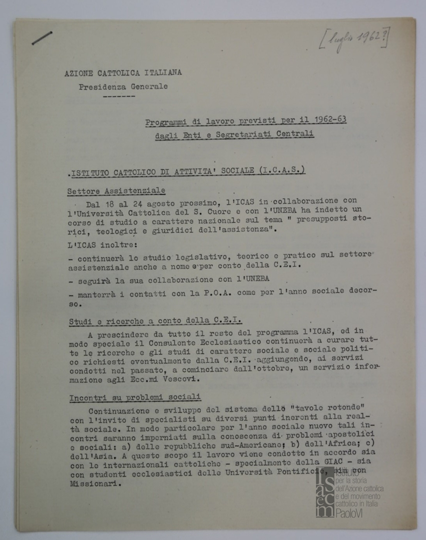 Programma delle attività dei seguenti enti: Istituto cattolico di attività sociale - ICAS; Istituto cattolico per l'educazione - ICE; Ente dello spettacolo; Segretariato per la moralità. Dattiloscritto