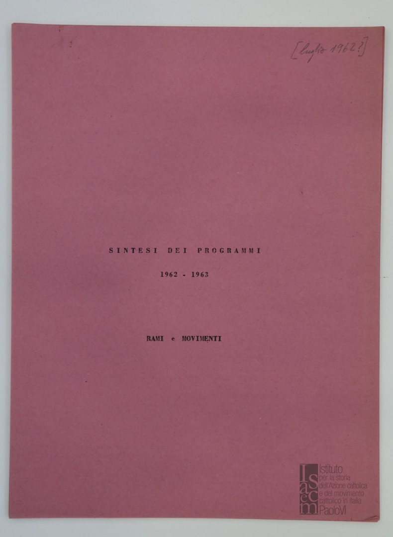 Attività delle seguenti associazioni: Unione uomini di AC, Unione donne di ACI, GIAC, Gioventù femminile di ACI, Congresso delegate giovanissime, FUCI, Movimento laureati di ACI, Movimento maestri di ACI, enti e segretariati centrali. Dattiloscritto
