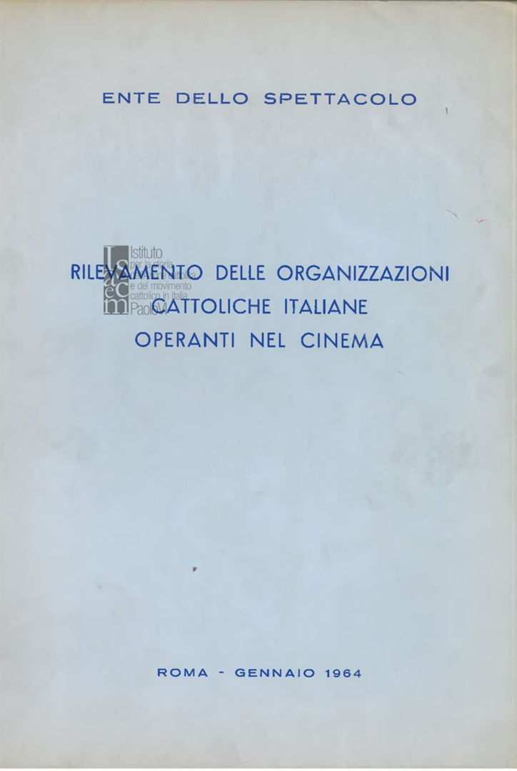 Rapporto sulle organizzazioni cattoliche operanti nel cinema: centri di insegnamento, organizzazioni culturali, produzione, distribuzione, esercizio, pubblicazioni, premi. Dattiloscritto, con copertina a stampa