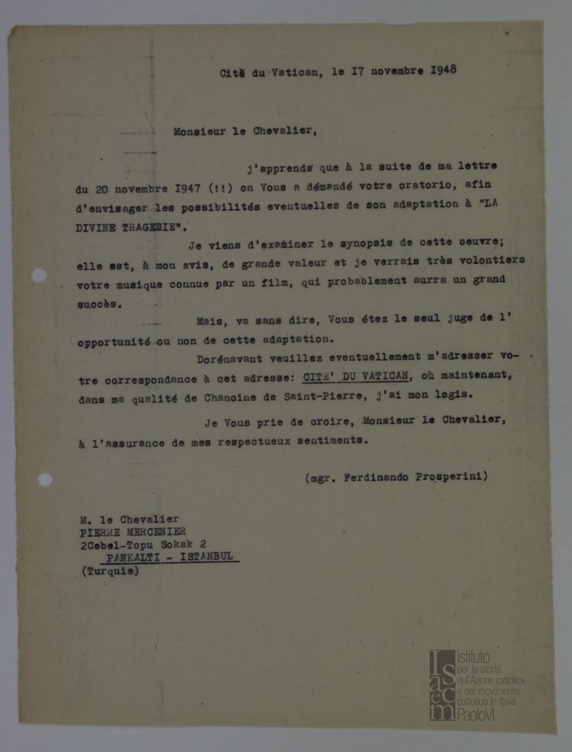 Mons. Ferdinando Prosperini scrive a Pierre Mercenier a proposito del progetto dell'opera La Divine Tragedie. Dattiloscritto