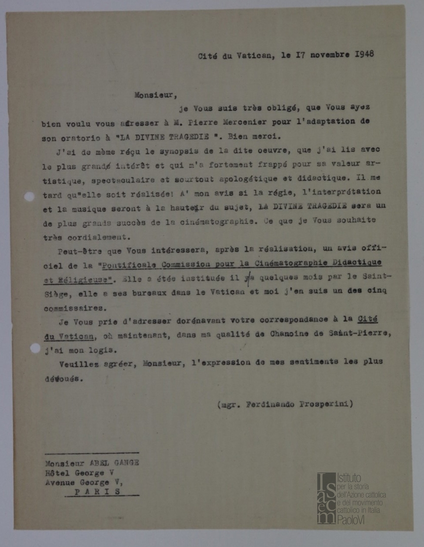 Lettera di mons. Ferdinando Prosperini a Abel Gance