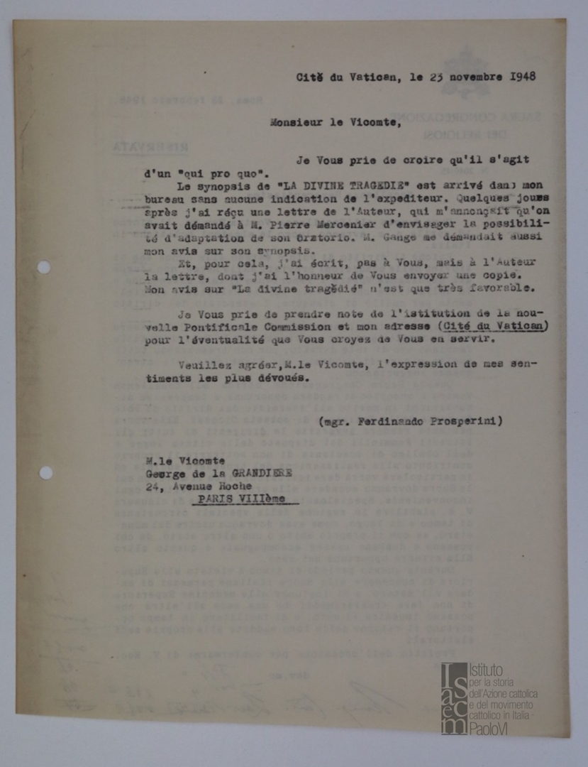 Mons. Ferdinando Prosperini scrive a George de la Grandiere a proposito del progetto dell'opera La Divine Tragedie. Dattiloscritto