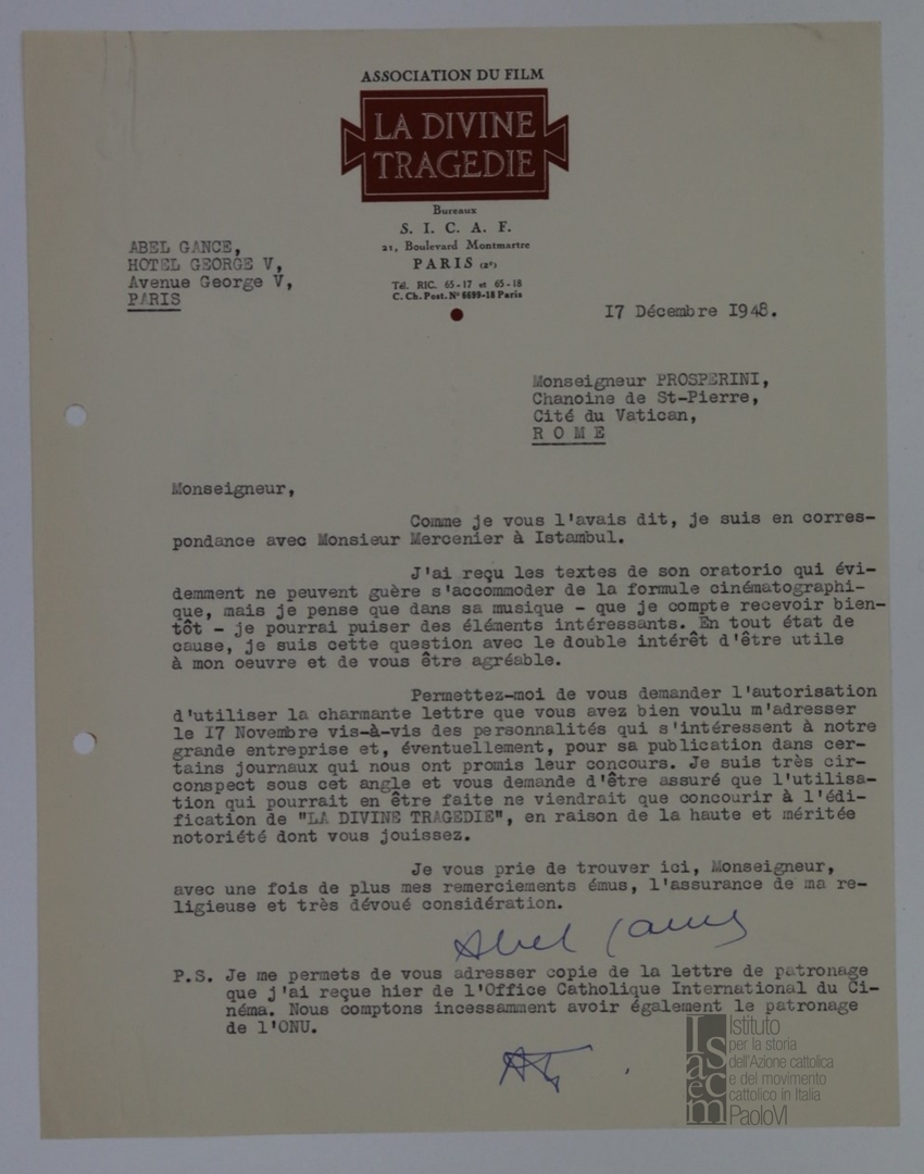 Abel Gance scrive a mons. Ferdinando Prosperini a proposito del progetto dell'opera cinematografica La Divine Tragedie e dell'adattamento dei testi dell'oratorio di Mercenier al film. Dattiloscritto