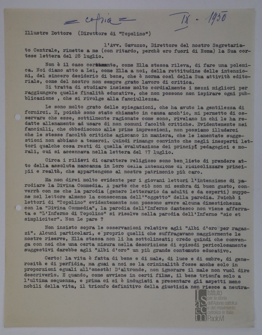 Mons. Ferdinando Prosperini muove alcune critiche al direttore del periodico "Topolino" sottolineando le finalità educative e i principi pedagogici e morali che devono ispirare le pubblicazioni destinate ai ragazzi. Dattiloscritto