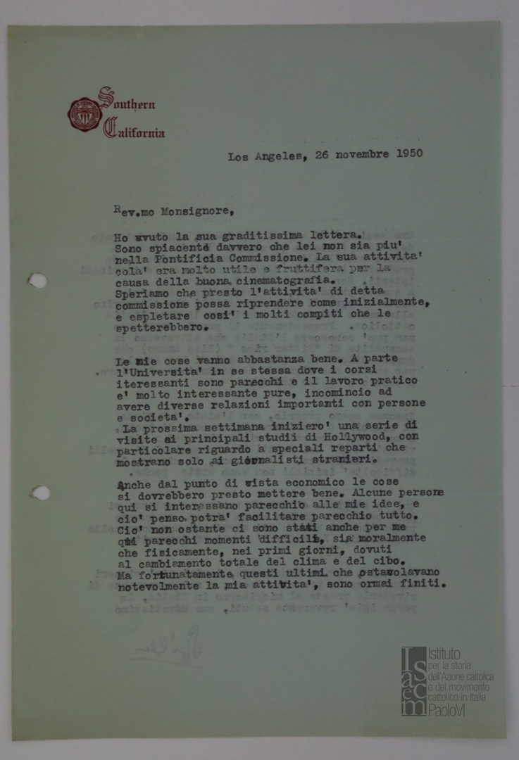 Scambio di comunicazioni di carattere personale e a proposito della necessità di promuovere la cultura cattolica italiana negli Sati Uniti attraverso la cinematografia. Dattiloscritto