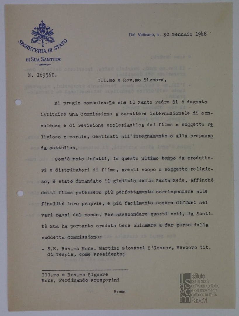 Giovanni Battista Montini comunica a mons. Ferdinando Prosperini l'istituzione di una commissione a carattere internazionale di consulenza e di revisione ecclesiastica dei film a soggetto religioso o morale destinati all'insegnamento o alla propaganda cattolica. Comunica inoltre i nominativi dei membri che ne fanno parte. Dattiloscritto