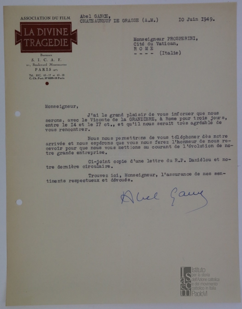 Abel Gance comunica a mons. Ferdinando Prosperini le date per un incontro destinato all'esame del progetto del film La Divine Tragedie. Dattiloscritto
