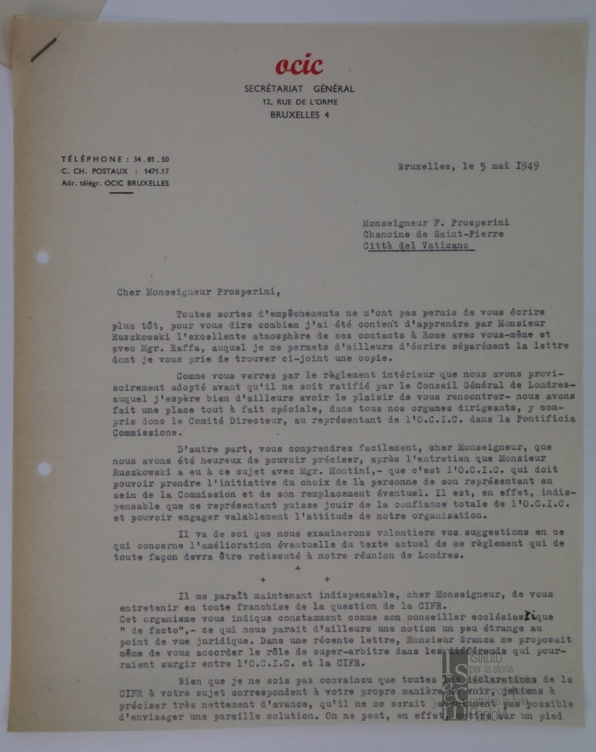 Lettera di Jean Bernard, presidente dell'Organisation catholique internationale du cinéma - OCIC, a mons. Ferdinando Prosperini
