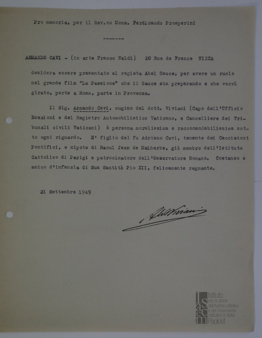 Segnalazione del sig. Armando Cavi per la partecipazione al film "La Passione" [La Divine Tragedie]. Dattiloscritto