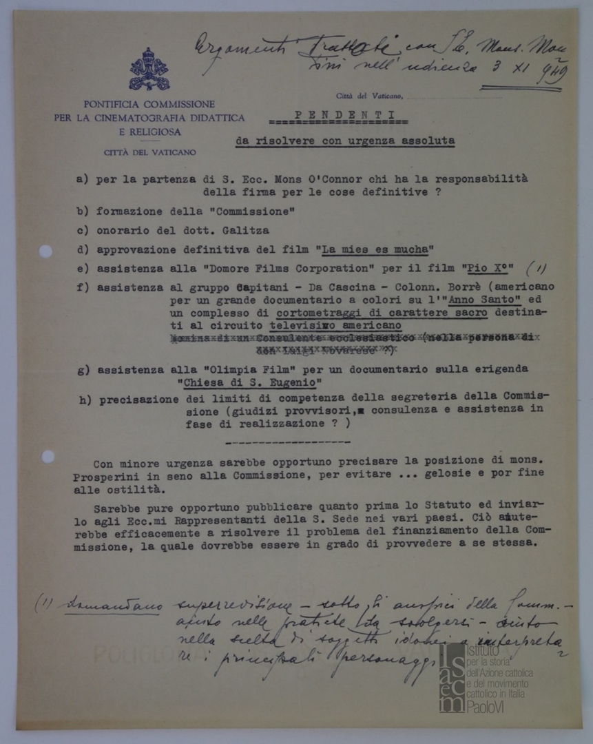 Appunto su carta intestata della Pontificia Commissione per la Cinematografia didattica e religiosa