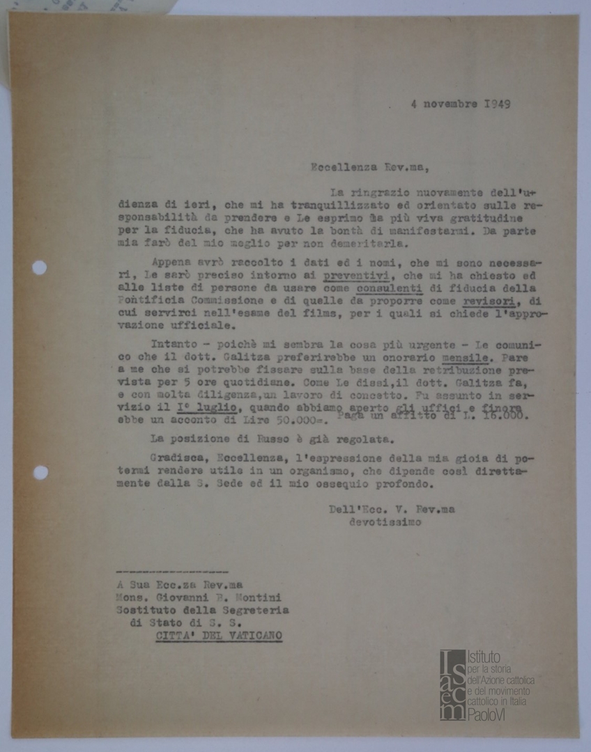 Lettera non firmata indirizzata a mons. Giovanni Battista Montini, sostituto alla segreteria di Stato di Sua SantitÃ