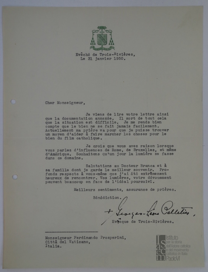 Lettera di mons. Leon Pellettier, vescovo di Trois-Rivières in Quebec (Canada), a mons. Ferdinando Prosperini