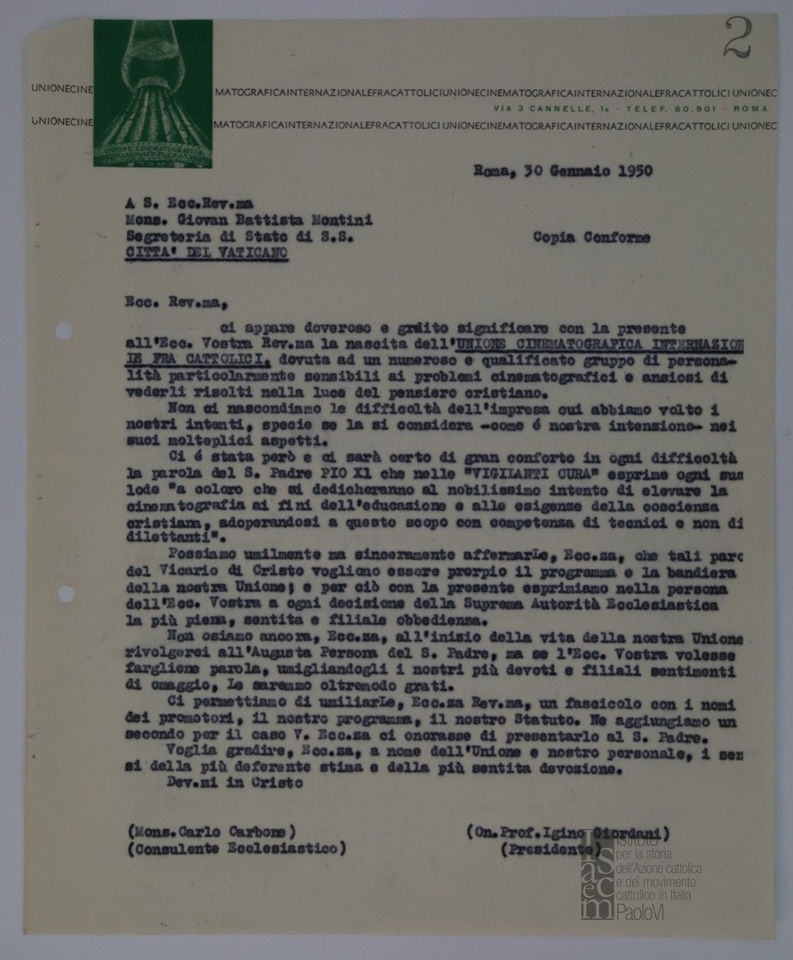 Carlo Carbone e Igino Giordani annunciano a mons. Montini la costituzione della "Unione cinematografica internazionale fra cattolici". Dattiloscritto