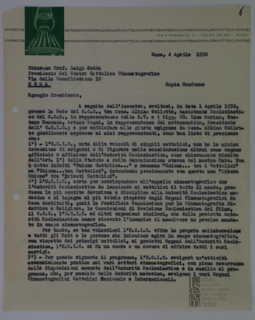 Lettera di Igino Giordani, presidente dell'Unione cinematografica internazionale fra cattolici - UCIC, a mons. Luigi Gedda, presidente dell'Ente cattolico dello spettacolo