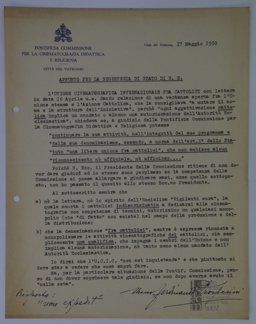 Osservazioni sulla controversia sorta tra l'Unione cinematografica internazionale fra cattolici - UCIC e l'ACI. Dattiloscritto