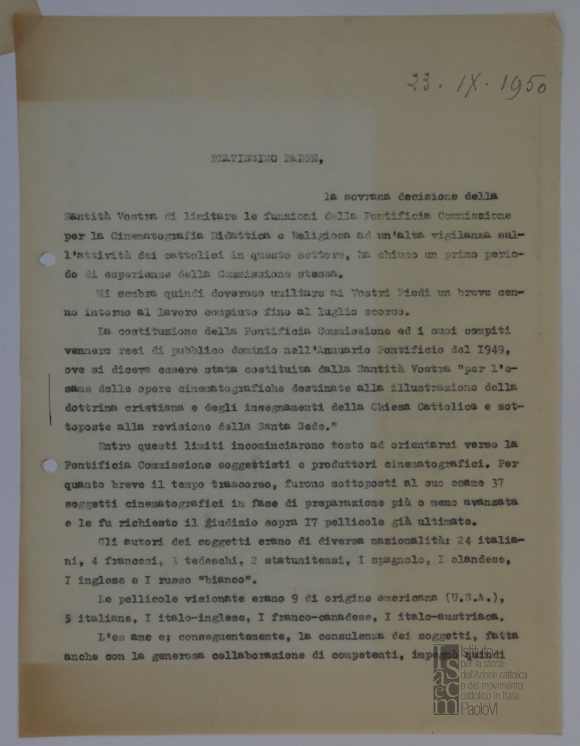 Mons. Ferdinando Prosperini invia a papa Pio XII alcuni prospetti riepilogativi dell'attività da lui svolta in seno alla Pontificia commissione per la cinematografia didattica e religiosa riguardante la valutazione delle opere cinematografiche destinate all'illustrazione della dottrina cristiana e degli insegnamenti della chiesa cattolica. Dattiloscritto
