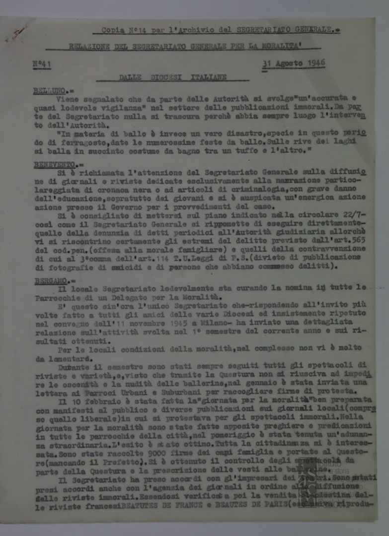 "Relazione del Segretariato Generale per la Moralità. Nr. 41"