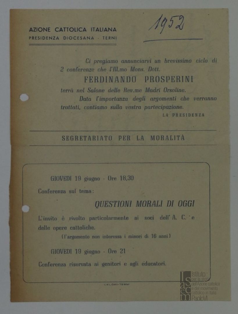 Conferenze di mons. Ferdinando Prosperini. Brochure e invito, a cura della Presidenza diocesana di Azione Cattolica di Terni. A stampa