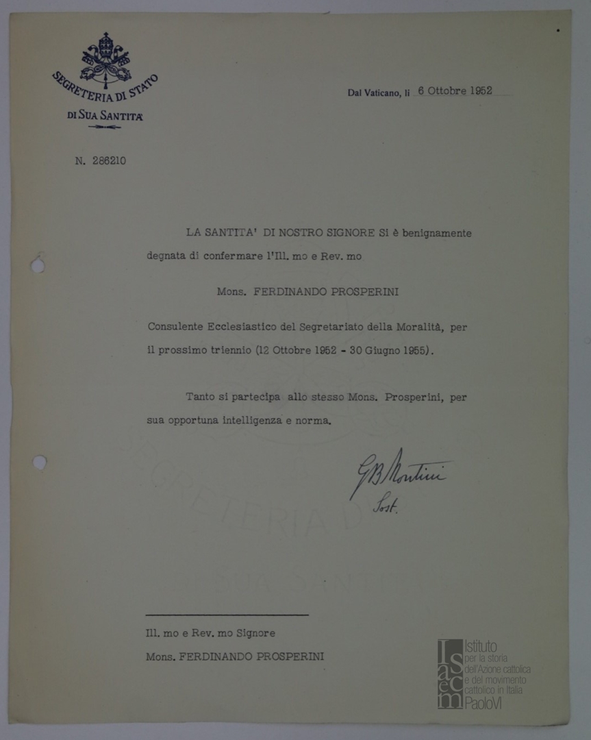 Mons. Giovanni Battista Montini comunica a mons. Ferdinando Prosperini la sua nomina a consulente ecclesiastico per il Segretariato della moralità per il triennio 1952-1955. Dattiloscritto