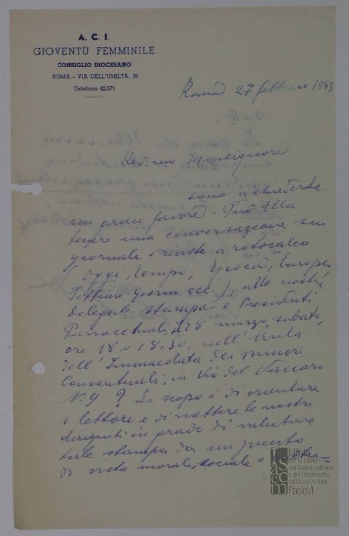 Lettera a firma di [...], del Consiglio diocesano della Gioventù femminile dell'ACI, indirizzata a mons. Ferdinando Prosperini