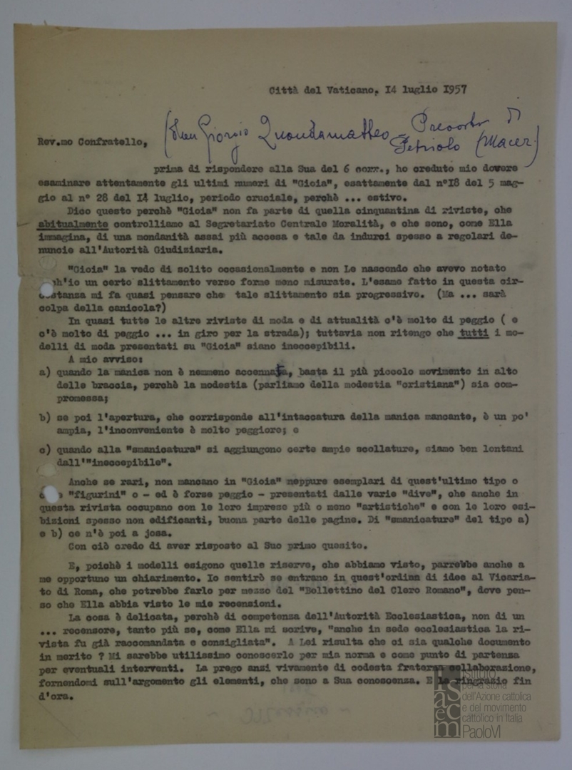 Mons. Ferdinando Prosperini risponde a don Giorgio Quondamatteo in merito alla moralità di alcuni contenuti del periodico di moda e attualità "Gioia". Dattiloscritto