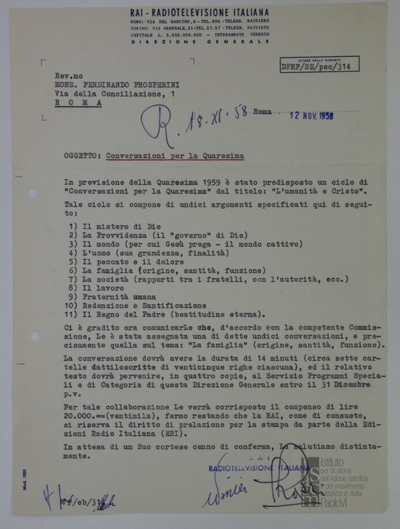 Lettera della direzione generale della RAI - Radiotelevisione italiana a mons. Ferdinando Prosperini