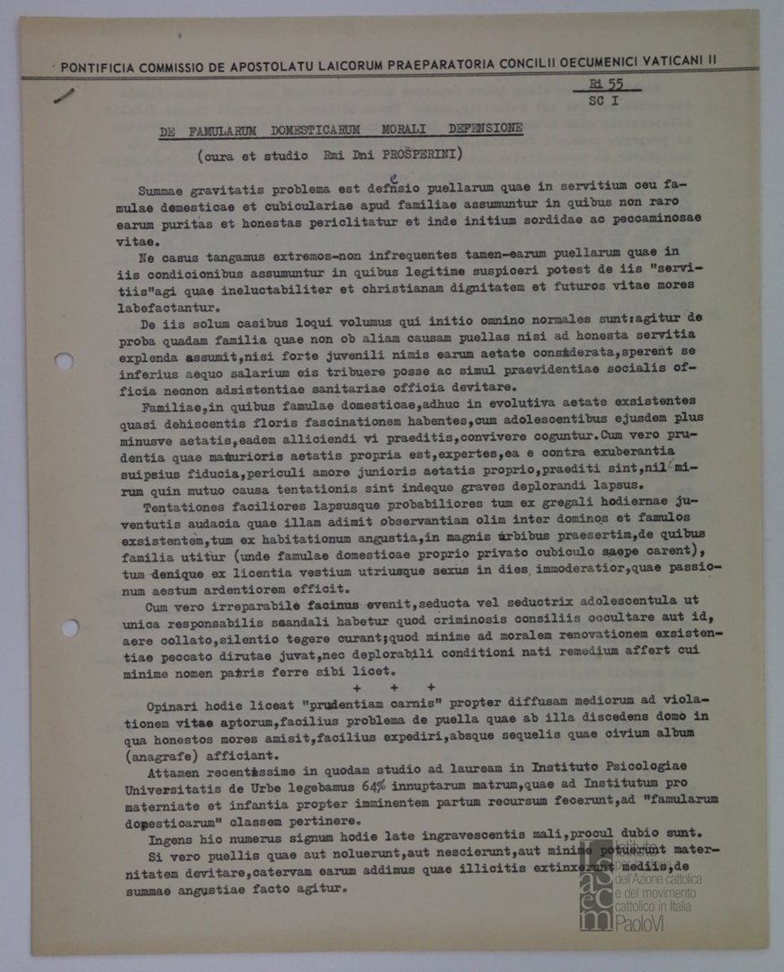 "Pontificia Commissio de Apostolatu Laicorum preparatoria Concilii Ecumenici Vaticani II. De famularum domesticarum morali defensione", a cura di mons. Ferdinando Prosperini