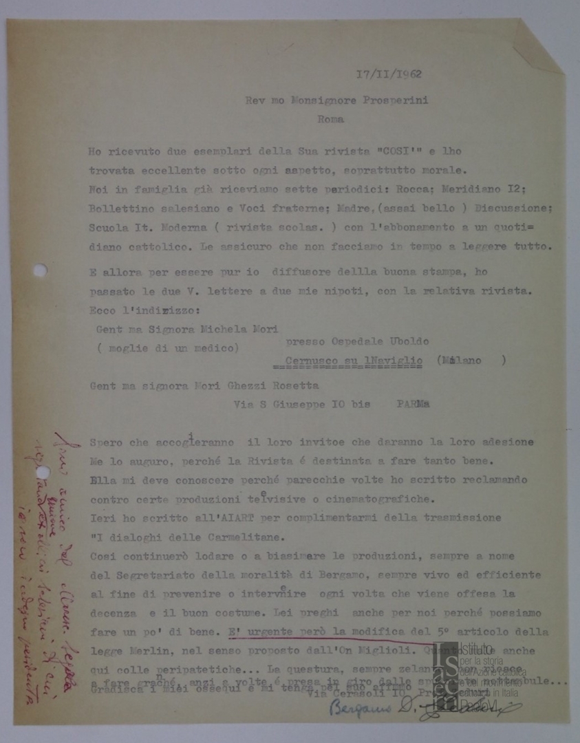 Lettera di D. Zeduri, del Segretariato della moralità di Bergamo, a mons. Ferdinando Prosperini