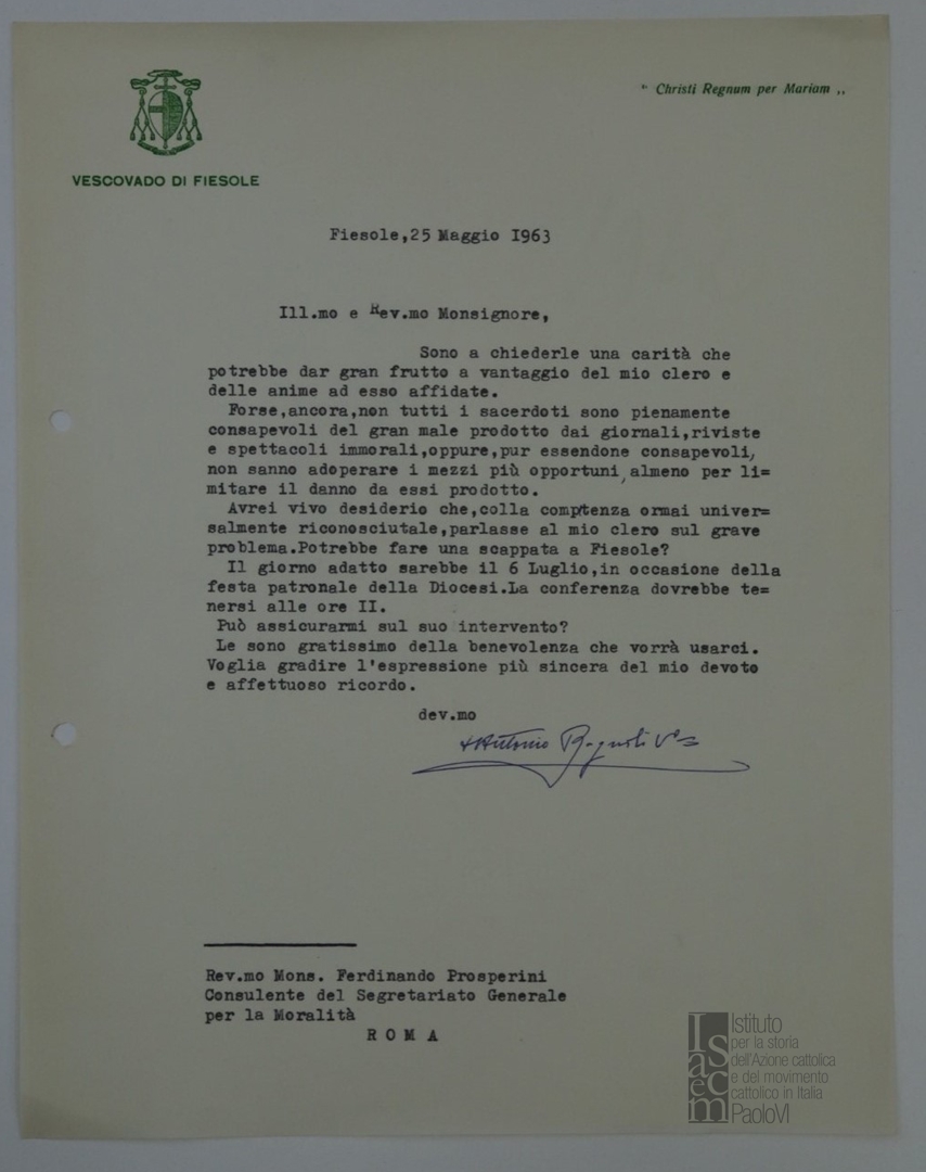 Don Antonio Bagnoli chiede a mons. Ferdinando Prosperini di intervenire ad una conferenza sui temi della difesa della moralità da tenersi a Fiesole. Dattiloscritto