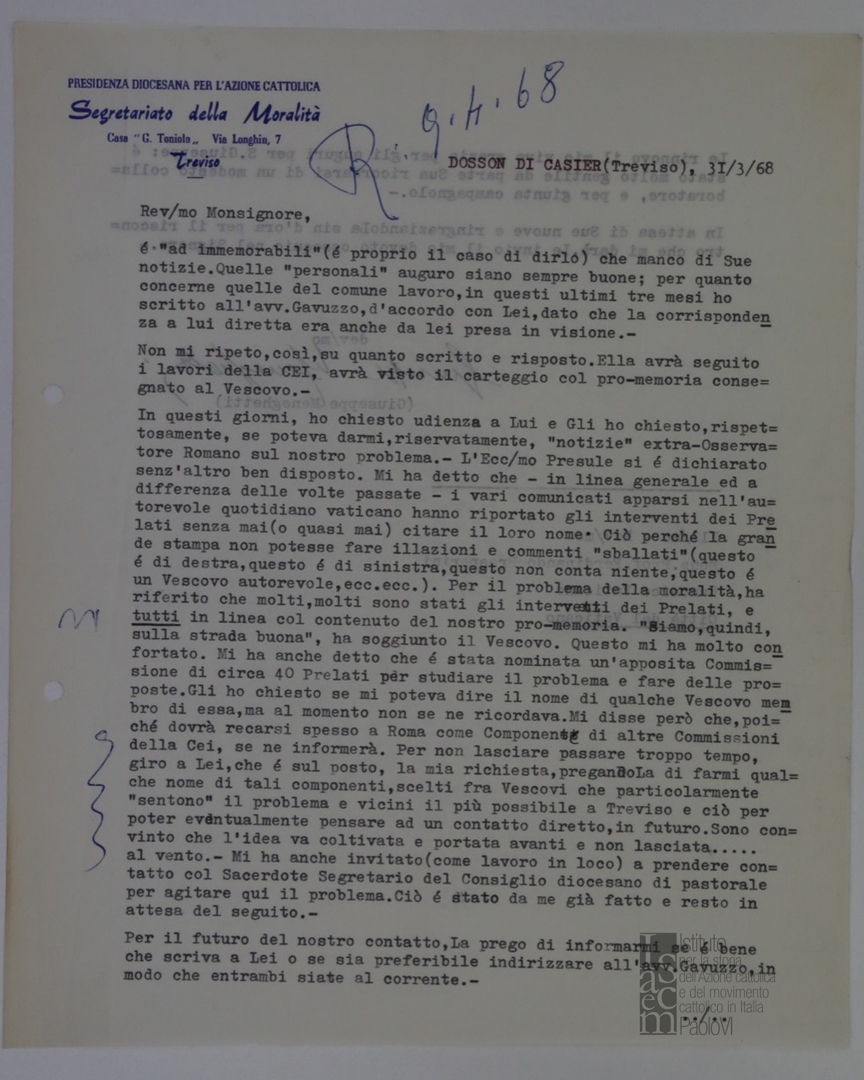 Lettera di Giuseppe Meneghetti, del Segretariato della moralità di Treviso, a mons. Ferdinando Prosperini