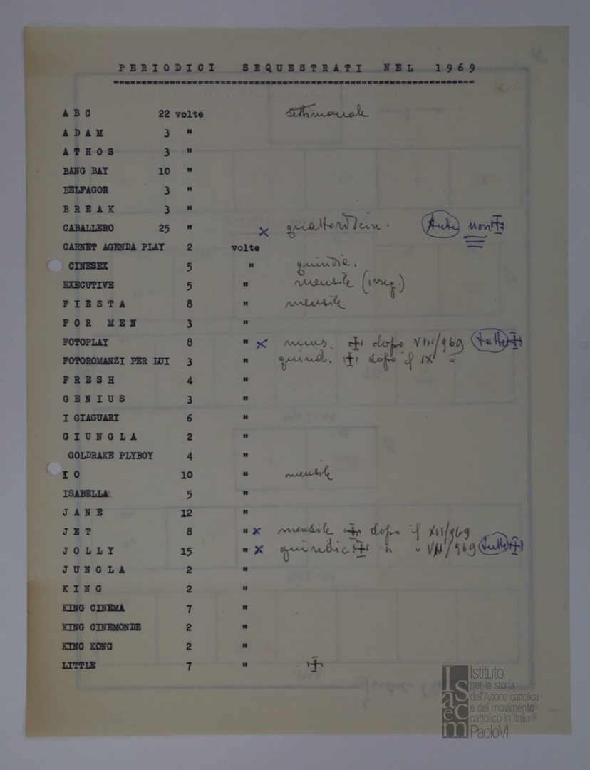 "Periodici sequestrati nel 1969" e "Pellicole sequestrate nel 1969"
